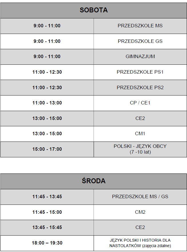 Nasza kadra pedagogiczna to nauczyciele zawodowi. Pracujemy z podręcznikami zatwierdzonymi przez ministerstwo edukacji i dystrybuowanymi przez ORPEG – Ośrodek Rozwoju Polskiej Edukacji za Granicą. Nauczycielki prowadzą również zajęcia według własnych pomysłów i metod.